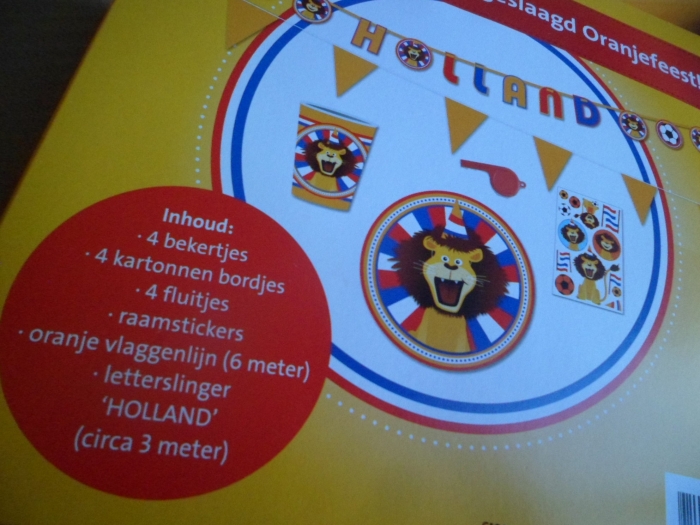 PARTIJ 15 DELIG ORANJE FEEST SET SET BESTAAT UIT : 4 BORDEN, 4 BEKERTJES, 4 FLUITJES, RAAMSTICKERS, VLAGGENLIJN 6 MTR, LETTERSLINGER CA 3MTR AANTAL 144 SETS PRIJS € 108,00