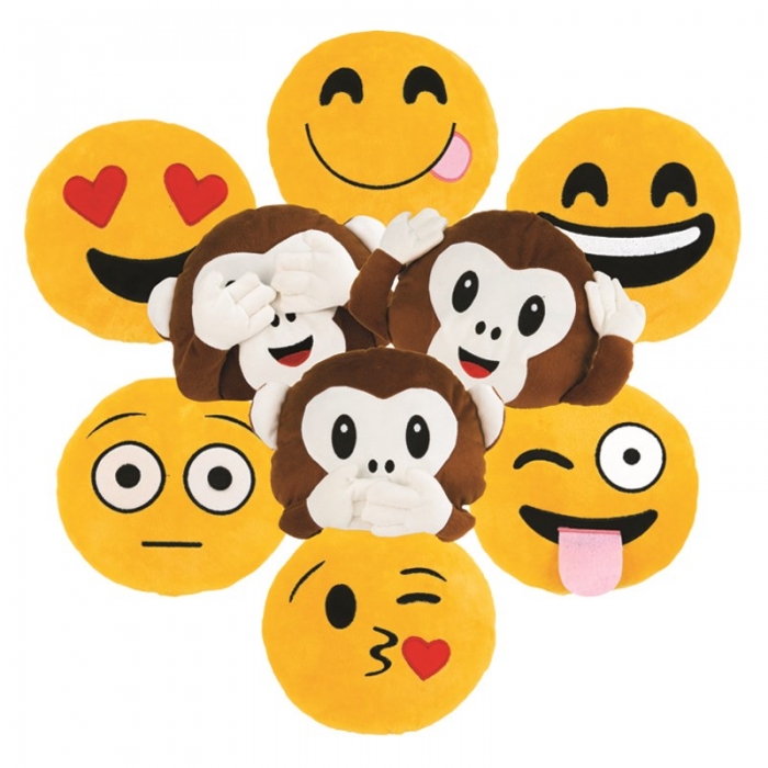 NIEUWE PARTIJ EMOTICON KUSSENS VAN 25 CM BINNEN! Er zitten 24 kussens in een doos die als volgt zijn verdeeld: - Gele kussens: per soort 3x - Monkeys: per soort 2x Minimale aankoop: 5 dozen