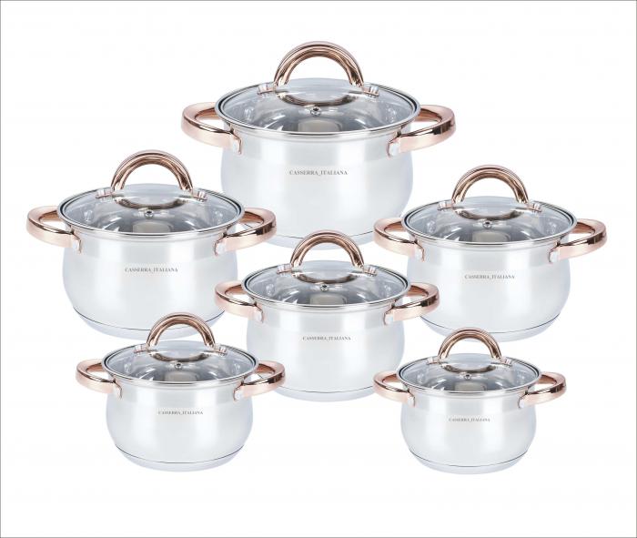 Aanbieding voor groothandel en wederverkopers: 12-delige roestvrijstalen pannenset van het merk Casserra Italiana. Deze complete set combineert duurzaamheid, functionaliteit en een elegant design, waardoor hij zeer geschikt is voor retail, webshops en marketplaces.