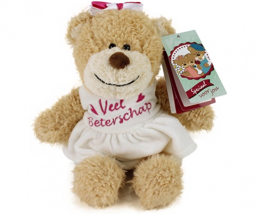 Deze knuffels zijn 22 cm groot/hoog, en dragen een bloem en een jurk met de tekst "veel beterschap"