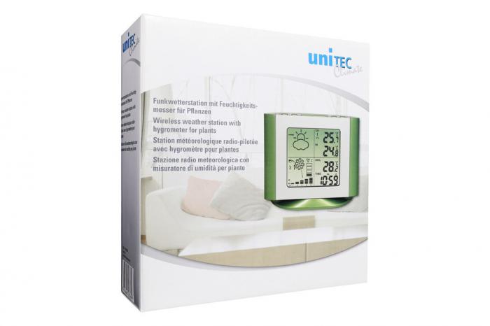 Met het W263 draadloze weerstation van UNITEC CLIMATE kun je altijd de huidige temperatuur en vochtigheid binnen en buiten in de gaten houden. De grondsensor geeft je ook informatie over de bodemvochtigheid en -temperatuur. Deze gegevens worden draadloos doorgestuurd naar het basisstation en activeren indien nodig het praktische bewateringsalarm. Zo heb je de bewatering van je planten altijd onder controle.
