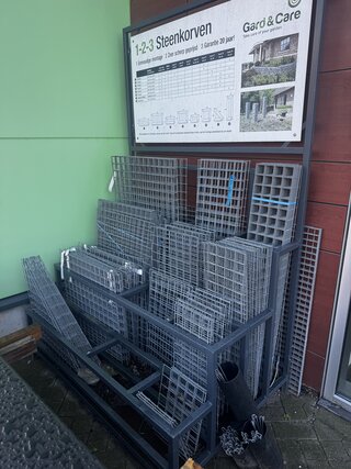 123 Steenkorvenrek + voorraad, Staal, verschillende afmetingen, , Voorraad rek vol met steenkorf panelen en gegalvaniseerd staal. Hiermee kan je zelf je steenkorven maken.,