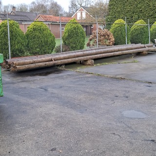 12x Houten ronde paal, , lengte ca. 10 meter, doorsnede ca. 12-21cm, , , loc buiten