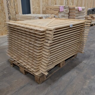 16x Rekken t.b.v. aardappelkisten, Vuren, rekwerk lengte: 119cm; breedte: 109cm; dikte: 4cm; totale afmetingen pallet (lxbxh) 980x1200x785, nieuw, Partij met in elkaar gezette rekken voor het produceren van aardappelkisten.