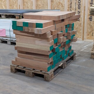 Ca. 108x Meranti balk, Meranti, lengte: ca. 65-75cm, breedte: ca. 12cm, dikte: ca. 7cm, gebruikt, Partij hardhout meranti balkjesaantal: 108 aantal meter aan meranti: 75 M