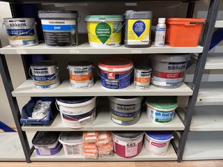 Ca. 19x Diversen w.o. primer, hechtmiddel, voorstrijk, W.o. Sikkens, Griffon, Knauf, , Nieuw en gebruikt., Deze kavel bevindt zich op de 1e verdieping.