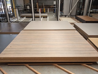 Ca. 22x Spaanplaat v.v. melamine, , , , o.a. :4x ca. 279,5x210cm, dikte ca. 18mm9x ca. 280,5x210,5cm, dikte ca. 18mm, hal buiten