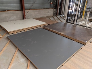 Ca. 27x Plaatmateriaal v.v. HPL/fineer/melamine, mdf / spaanplaat, max ca. 280x207cm, diverse diktes, , , hal buiten