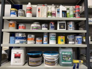 Ca. 33x Diversen w.o. betoncirestuc, isoleermiddel, matlak, primer, W.o. Stucco D'Or, Sikkens, Griffon, Den Braven, , Nieuw en gebruikt., Deze kavel bevindt zich op de 1e verdieping.