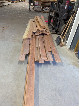 Ca. 63x Gevelbekleding rabat Bruin, Hout, D: 18mm, B: 140mm, Nieuw, Partij rabat gevelbekleding met de maat circa 18x140mm, lengten ca.: 13x420, 4x295cm, 28x125cm, 7x100cm, 1x 80cm en 1x 240cm. Daarnaast nog 8 stuks 100cm channel siding gevelbekleding.