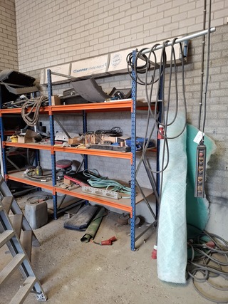Inhoud ruimte, , , , bestaande uit: o.a. palletstelling (diverse maten); 2x magazijnkast met inhoud; inhoud wandbord; werktrap; schoonmaakkar; hydrauliekslang; olie lekbak, diverse oliën; diverse gereedschappen; onderdelen en toebehoren,