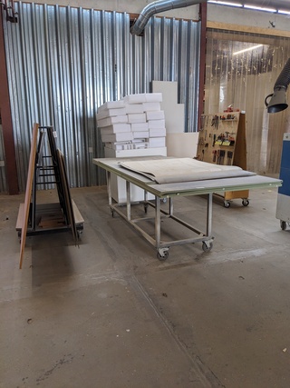 Partij diversen, , , , o.a. meubelpanelen afm ca. 304x131cm, dikte ca. 18mm (mdf HPL beplakt), 2x trespa plaatmateriaal ca. 303x100cm, dikte ca. 5mm, mdf plaat, platenwagen lxbxh ca. 134x80x155cm, verrijdbare werktafel lxbxh 201x70x88cm, verrijdbare transportbak met divers beschermingsmateriaal lxbxh ca. 100x100x107cm, Loc hal 4