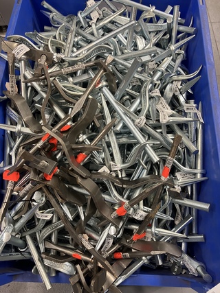 Partij Dakgootmateriaal ijzerwaren klemmen e.d., Nieuw, Inclusief ijzeren gitterkrat